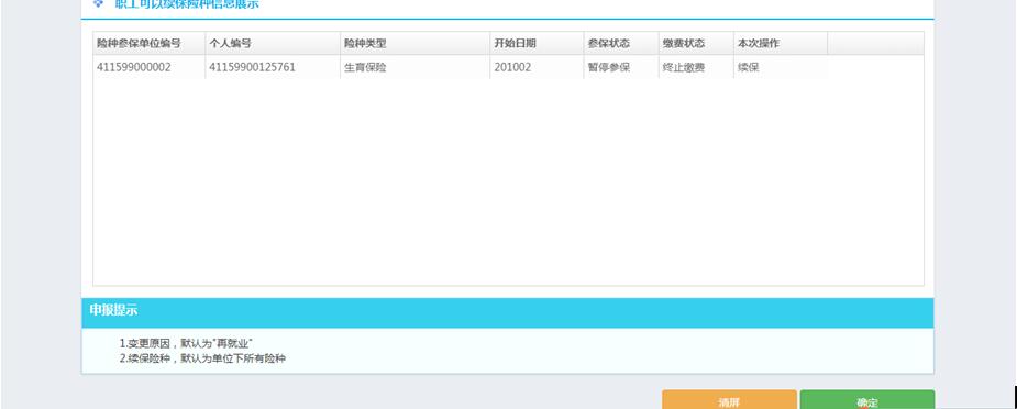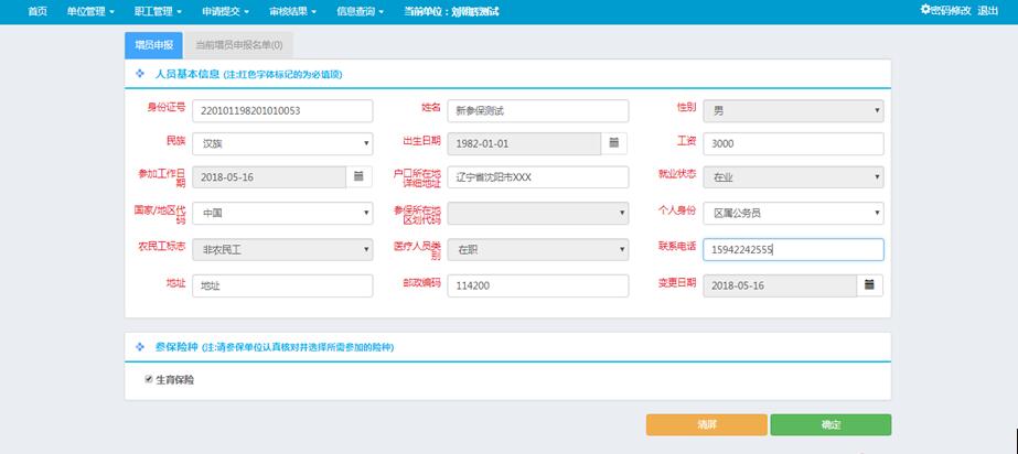1. 选择【增员申报】页,做单个人员的增员申报,可手工录入身份证号获取部分个人信息。填报完成个人信息及险种信息及工资后,点击【确定】按钮,完成增员申报。点击【清屏】按钮,清空屏幕上已填写的内容。