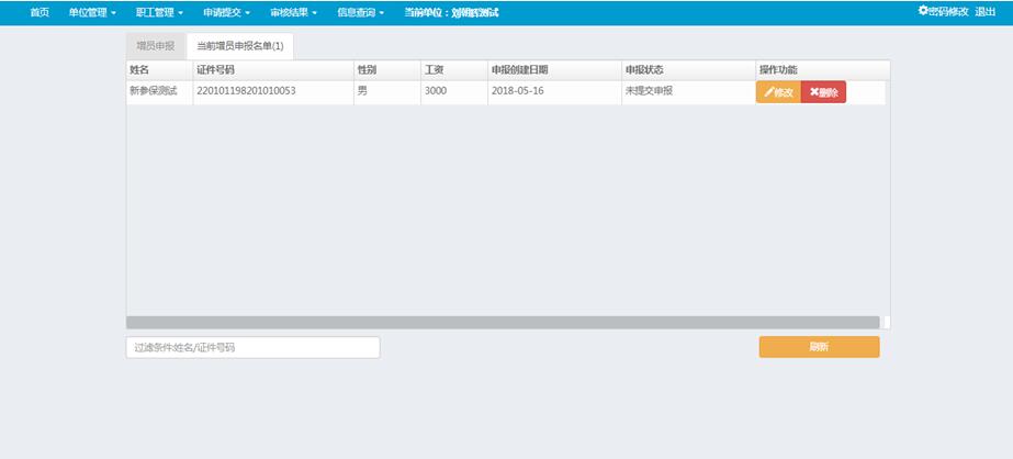 2.选择【当前登记申报名单】页,当前所有已申报完成,但未提交中心审批的申报内容,都在此页显示,可以修改或删除。