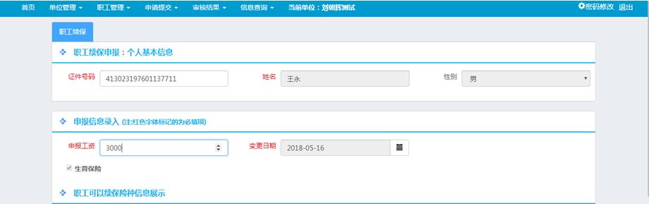 1.选择【职工续保申报】页,做单个人员的续保申报,可手工录入身份证号,点击空白部分获取对应人员信息;录入工资信息。点击【确认】完成续保功能。