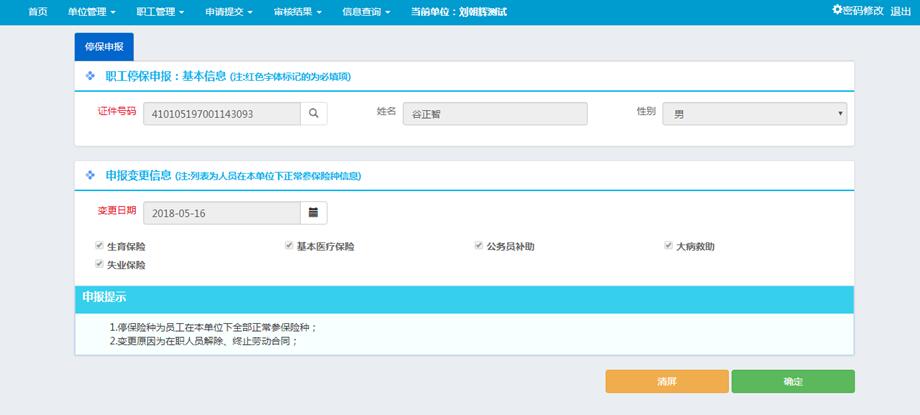 1.选择【减员申报】页,做职工的停保申报,获取到该单位所有正常参保的人员,点击【确定】按钮,完成停保申报。点击【重置】按钮,清空屏幕上已填写的内容。