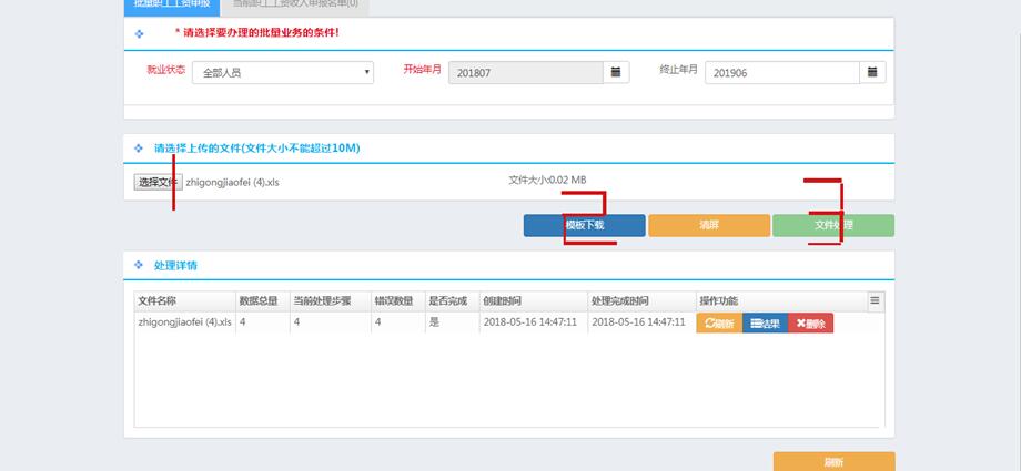 d) 点击【文件处理】按钮,进行文件信息上传,开始批量申报。