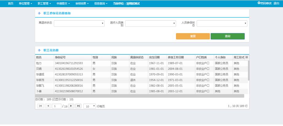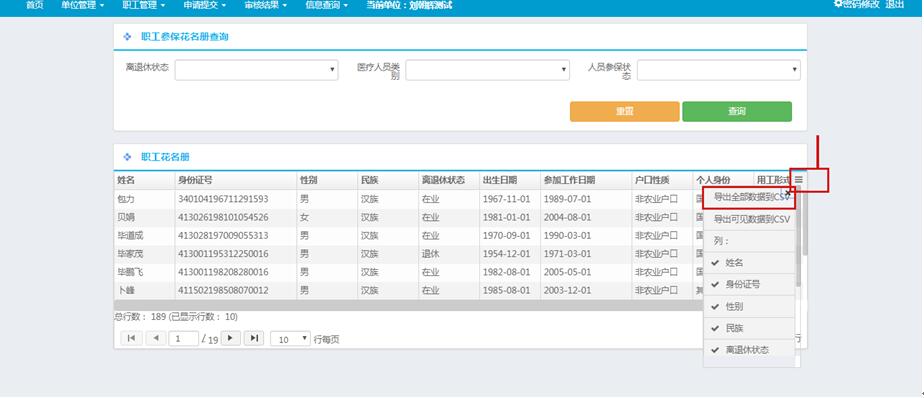 单位用户:点击“信息查询”—》“单位花名册查询”,进入页面后,根据条件点击查询按钮后,即可获取本单位花名册信息;可通过点击列表右上角可导出查询结果信息。